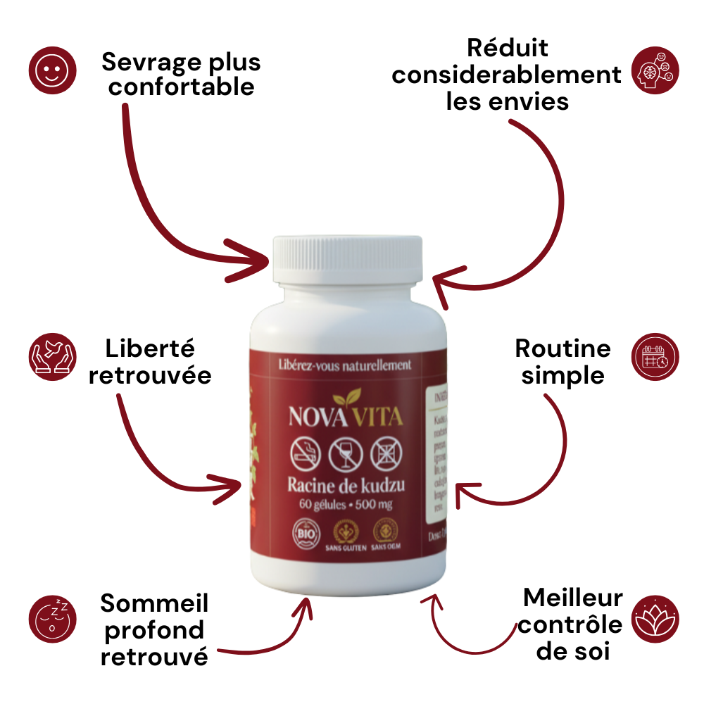 Oui, le Kudzu peut êtrecombiné avec d'autres plantespour potentialiser les effets. Pour le sevrage avec gestion du stress, il s'associe bien avec desplantes adaptogènescomme la rhodiola, le ginseng ou l'ashwagandha. Pour renforcer l'effet relaxant, vous pouvez le combiner avec lapassiflore, la valériane ou le magnésium. Cependant,évitez les associations avecdes traitements hormonaux, anticoagulants ou médicaments du système nerveux central sans avis médical. Une formulation enrichie envitamines B(comme le complexe B dans certains kudzu) optimise les bénéfices au quotidien.